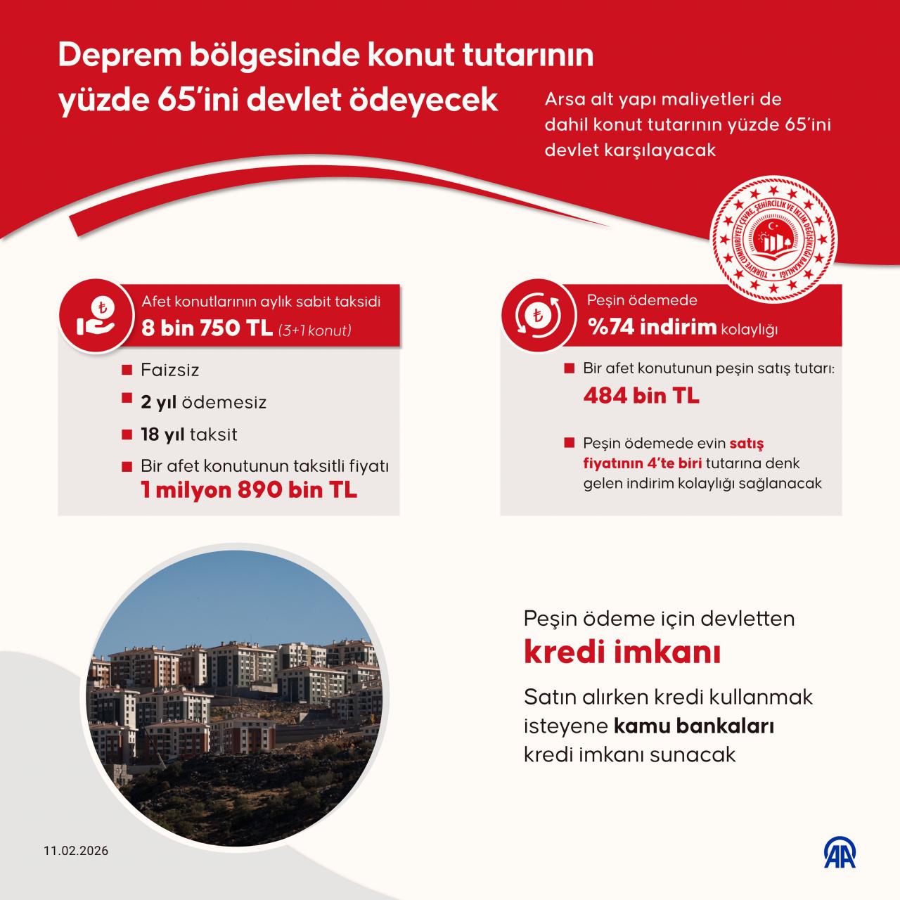Çevre, Şehircilik ve İklim Değişikliği Bakanı Murat Kurum da ödeme planına ilişkin sosyal medya hesabından yaptığı açıklamada, "Cumhurbaşkanımız Sayın Recep Tayyip Erdoğan açıkladı. Asrın felaketinden etkilenen illerimizde afet konutlarında ödemeler 2 yıl sonra başlayacak. Faizsiz, 18 yıl boyunca sabit fiyatla olacak." ifadelerini kullandı.