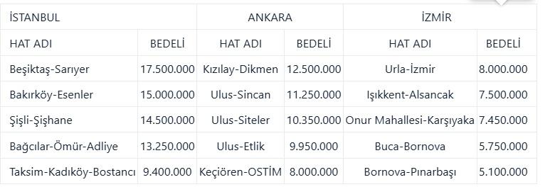 İnternette ilanı bulunan hatlardan Beşiktaş-Sarıyer için 17 milyon 500 bin lira, Bakırköy-Esenler 15 milyon lira ve Şişli-Şişhane 14 milyon 500 bin lira isteniyor.