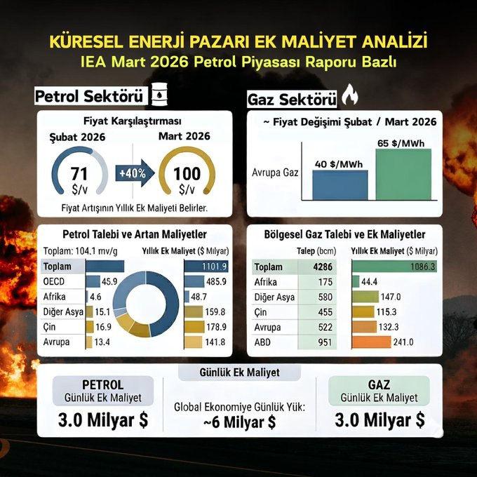 Eski Enerji ve Tabii Kaynaklar Bakanı, Karadeniz Ekonomik İşbirliği Parlamenter Asamblesi (KEİPA) Türkiye Delegasyonu Başkanı Fatih Dönmez, sosyal medya platformu X'teki hesabı üzerinden Uluslararası Enerji Ajansının (IEA) Mart 2026 Petrol Piyasası Raporu'nu baz alan kapsamlı bir infografik paylaşarak piyasalardaki son durumu değerlendirdi.