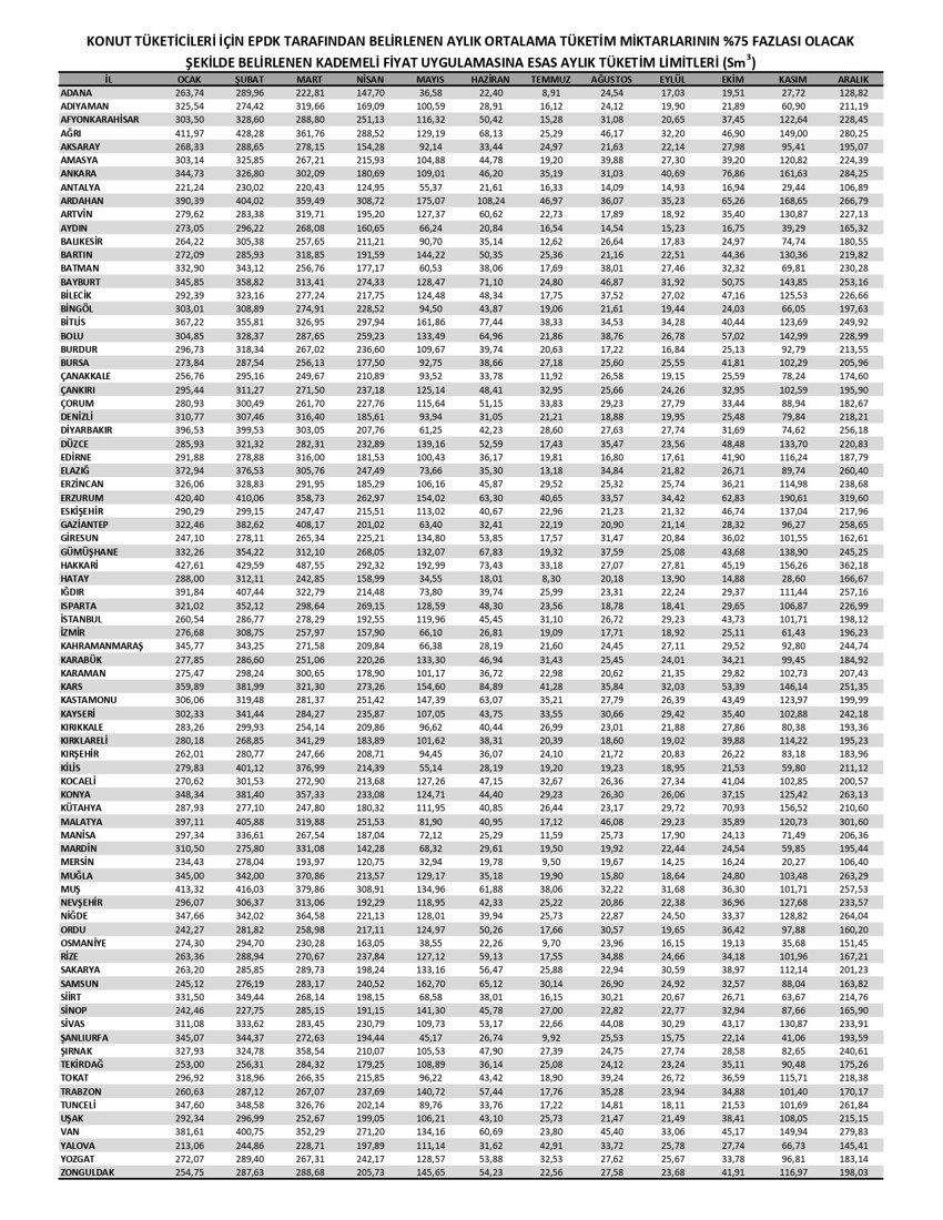 Ardından her il için aylık tüketim ortalamalarının yüzde 75 fazlası olacak şekilde aylık tüketim limitleri belirlenecek ve fiili tüketimin belirlenen aylık tüketim limitinin altında kalması durumunda, tüketime devlet desteğinin daha fazla olduğu fiyat uygulanacak.