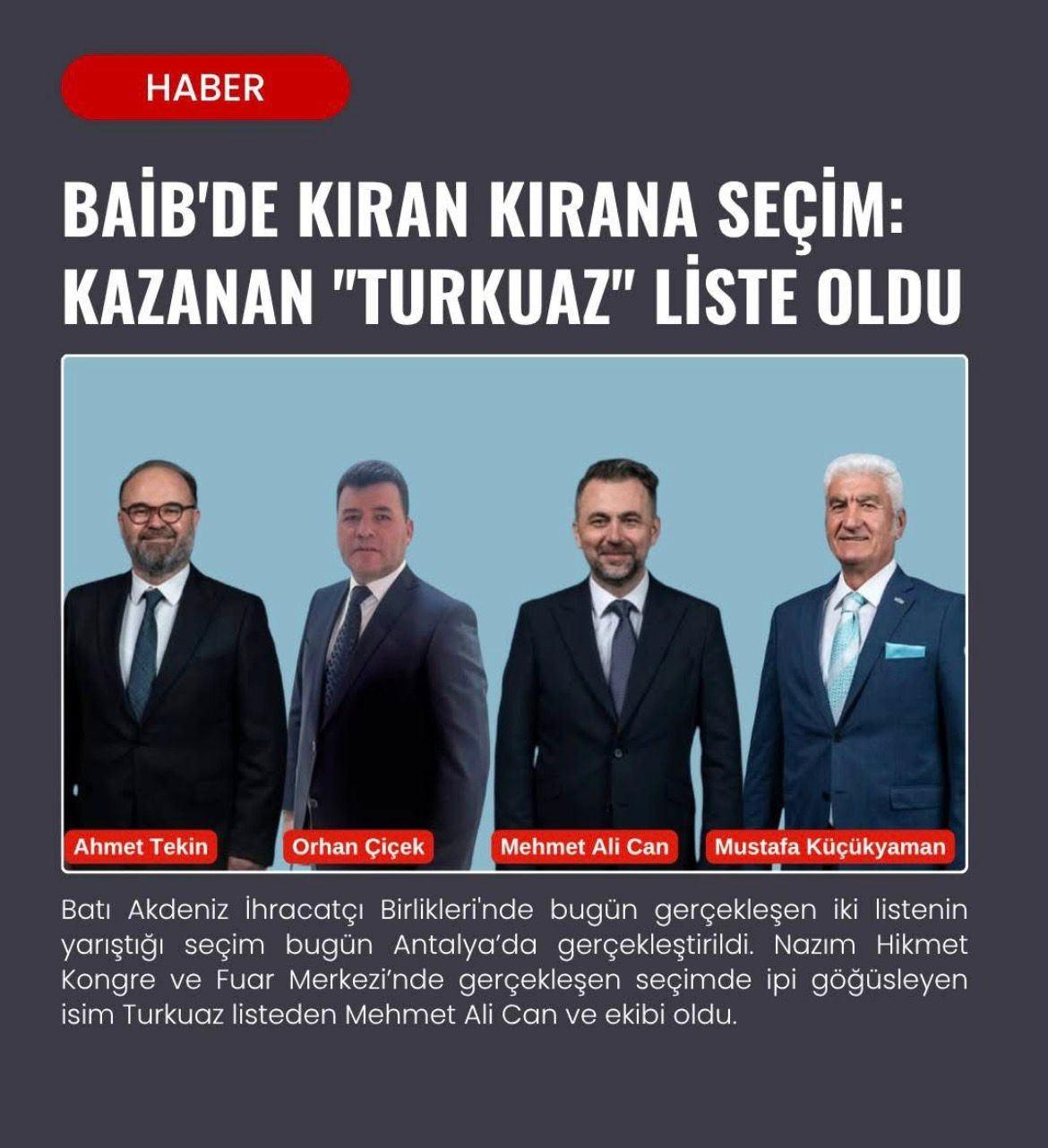 Antalya, Isparta ve Burdur'u kapsayan Batı Akdeniz İhracatçılar Birliği'nin (BAİB) olağan seçimli genel kurulu yapıldı. Seçimlere turkuaz liste ile giren Mehmet Ali Can, yeni BAİB Başkanı oldu. Şehrin önde gelen STK'ları Can'ı tebrik etti.