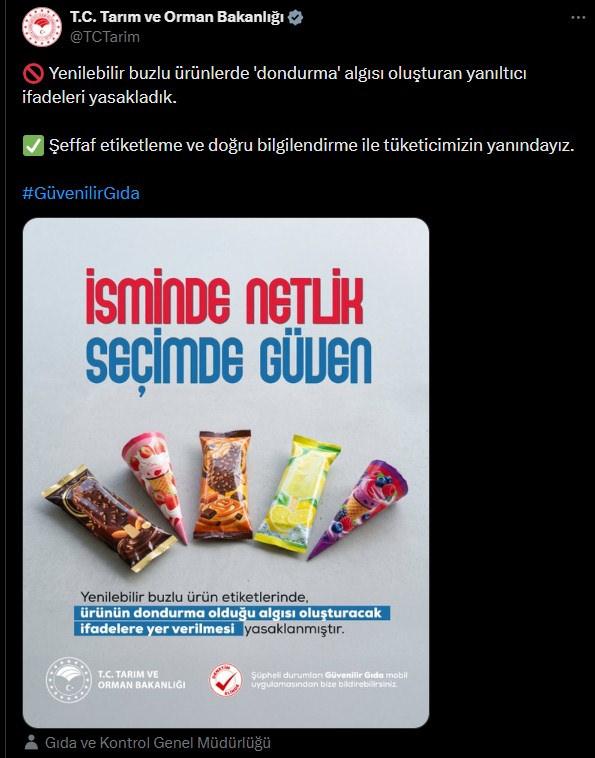 Konuyla ilgili Tarım ve Orman Bakanlığı'nın sosyal medya hesabından bir paylaşım yapıldı. "İsimde netlik seçimde güven" başlığıyla yayınlanan paylaşımda "Yenilebilir buzlu ürünlerde 'dondurma' algısı oluşturan yanıltıcı ifadeleri yasakladık. Şeffaf etiketleme ve doğru bilgilendirme ile tüketicimizin yanındayız." ifadeleri yer aldı.