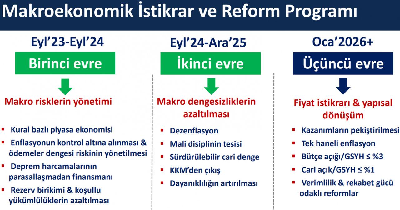 Konuşmasında Türkiye’nin borçluluk oranı açısından birçok ülkeye kıyasla avantajlı konumda olduğunu ifade eden Şimşek, uygulanan ekonomi programının üç aşamalı bir plan çerçevesinde ilerlediğini söyledi. Programın ilk aşamasında risklerin kontrol altına alındığını, ikinci aşamada makro dengesizliklerin azaltıldığını ve üçüncü aşamada kalıcı dönüşümün hedeflendiğini belirtti.