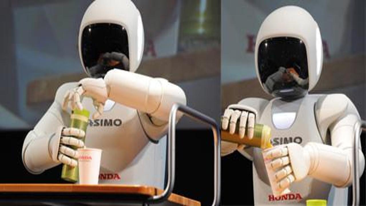 Ellerini rahatlıkla kullanabilen ASIMO, yuvarlak cisimleri kavrayabiliyor, bardakları birbirine boşaltabiliyor.