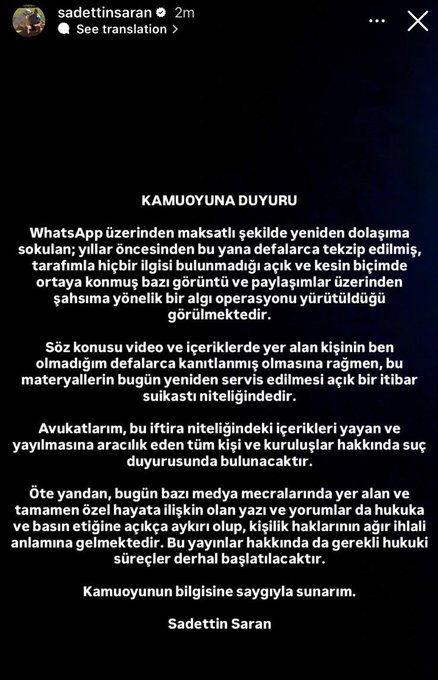 "WhatsApp üzerinden maksatlı şekilde yeniden dolaşıma sokulan; yıllar öncesinden bu yana defalarca tekzip edilmiş, tarafımla hiçbir ilgisi bulunmadığı açık ve kesin biçimde ortaya konmuş bazı görüntü ve paylaşımlar üzerinden şahsıma yönelik bir algı operasyonu yürütüldüğü görülmektedir.