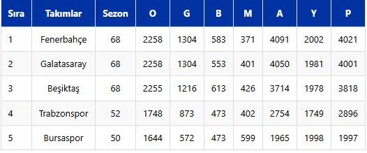 İki takım, geride kalan 2 bin 258 müsabakada bin 304'er galibiyet elde etti. Galibiyet sayısında açık ara önde olan iki takımı bin 216 galibiyetle Beşiktaş takip etti.