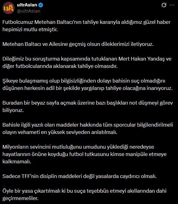 ultrAslan'ın sosyal medya platformu X'ten yaptığı açıklamada şu ifadeler kullanıldı: