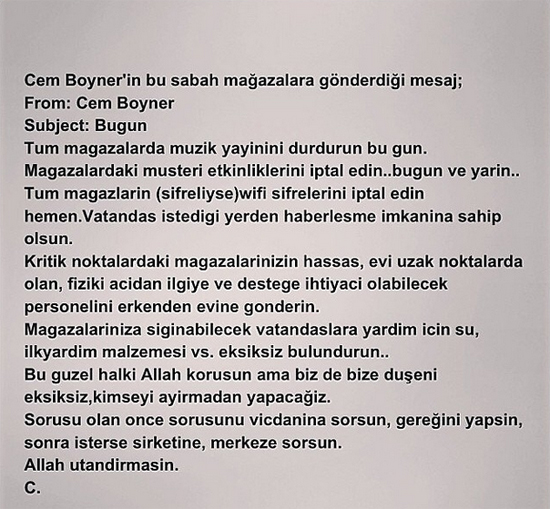 "Tüm mağazalarda müzik yayınını durdurun bu gün. Mağazalardaki müşteri etkinliklerini iptal edin.. Bugün ve yarın.. Tüm mağazların (şifreliyse) wifi şifrelerini iptal edin hemen. Vatandas istediği yerden haberleşme imkanına sahip olsun. Kritik noktalardaki magazalarinizin hassas, evi uzak noktalarda olan, fiziki acidan ilgiye ve destege ihtiyaci olabilecek personelini erkenden evine gonderin. Magazalariniza siginabilecek vatandaslara yardim icin su, ilkyardim malzemesi vs. eksiksiz bulundurun.. Bu guzel halki Allah korusun ama biz de bize duşeni eksiksiz,kimseyi ayirmadan yapacağiz. Sorusu olan once sorusunu vicdanina sorsun, gereğini yapsin, sonra isterse sirketine, merkeze sorsun. Allah utandirmasin."