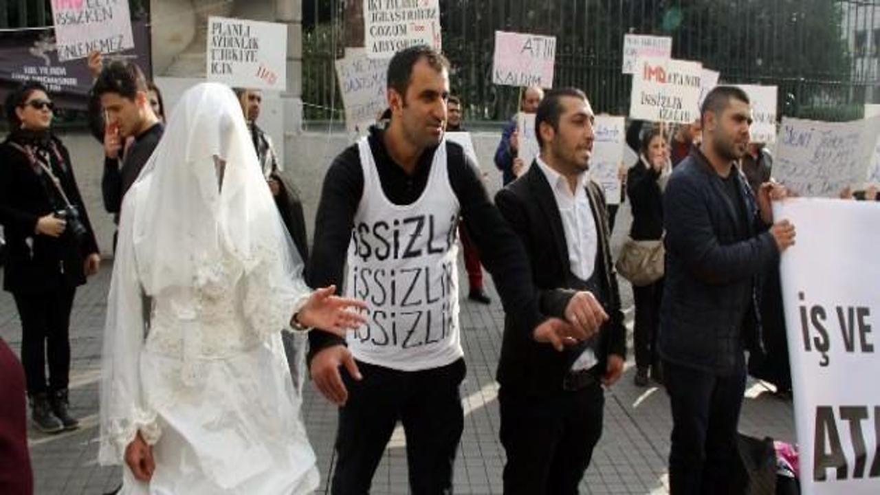 Beyoğlu Galatasaray Meydanı’na bir araya gelen yaklaşık 40 iş ve meslek danışmanı, "İşsiz iş ve meslek danışmanları atama istiyor" yazılı pankart açtı. Bir iş ve meslek danışmanı eyleme gelinlik giyerek eyleme katıldı.