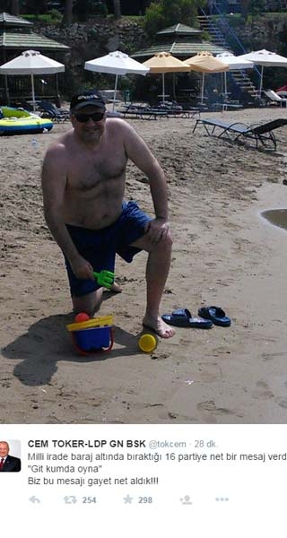 Toker, "Milli irade baraj altında bıraktığı 16 partiye net bir mesaj verdi. "Git kumda oyna" Biz bu mesajı gayet net aldık!!!" diye yazdı, plaj fotoğrafını paylaştı.