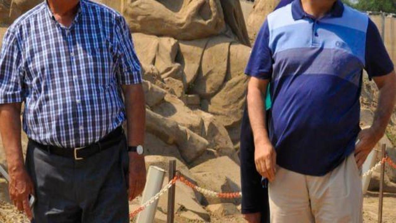 Eşi ve misafirleriyle sergiyi gezen Türker, kum heykellerini izleyerek, ziyaretçilere heykellerin hikayeleri hakkında bilgi verdi.