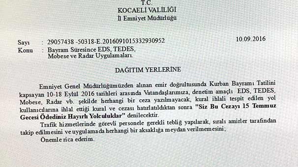 Kocaeli Emniyet Müdürlüğü bugün Emniyet Genel Müdürlüğü’nden gelen emiri yayınladı. Trafik ekiplerine gönderilen emirde Kurban Bayramı tatili boyunca sürücülere Elektronik Denetleme Sistemi (EDS), Trafik Elektronik Denetleme Sistemi (TEDES), Mobese ve radar aracılığıyla ceza kesilmemesi istenilerek, sürücülere yaptıkları kural ihlali ve cezasının sözlü olarak hatırlatılılarak,"Siz bu cezayı 15 Temmuz gecesi ödediniz. Hayırlı yolculuklar" denilmesi istendi.