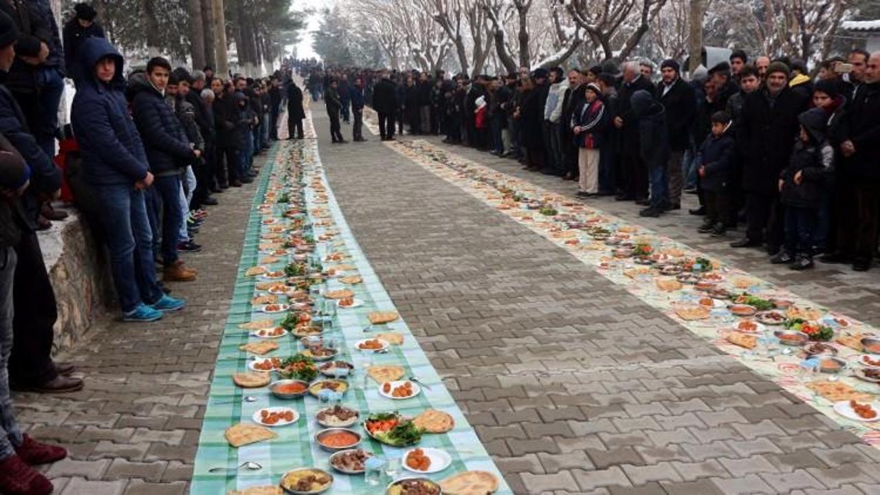 Yapılan konuşma ardından konuklara, 2 kilometre uzunluğundaki yer sofrasında kuru fasülye, et, pilav, bulgur ve tatlı ikram edildi.