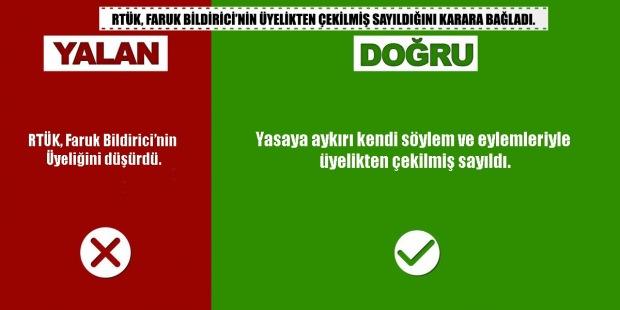 Geçtiğimiz Temmuz ayında Radyo ve Televizyon Üst Kurulu (RTÜK)'undan boşalan 3 üye kadrosuna görevlendirmeler yapılmış, Faruk Bildirici de CHP kontenjanından RTÜK üyesi seçilmişti. Bildirici tarafsızlık ve gizlilik ilkelerini zedelediği gerekçesiyle ‘üyelikten çekilmiş sayılarak’ RTÜK üyeliğinden düşürüldü. Konuyla ilgili sosyal medyada olay çarpıtılarak algı operasyonları yürütülmeye başlandı.