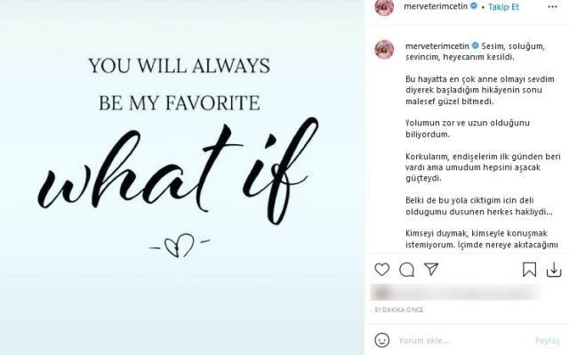 Sosyal medyadan yaptığı açıklamada, çok üzüntülü olduğunu dile getiren Çetin, "Sesim, soluğum, sevincim, heyecanım kesildi. 'Bu hayatta en çok anne olmayı sevdim' diyerek başladığım hikâyenin sonu maalesef güzel bitmedi. Yolumun zor ve uzun olduğunu biliyordum. Korkularım, endişelerim ilk günden beri vardı ama umudum hepsini aşacak güçteydi. Belki de bu yola çıktığım için deli olduğumu düşünen herkes haklıydı... Kimseyi duymak, kimseyle konuşmak istemiyorum. İçimde nereye akıtacağımı bilemediğim koca bir keder nehri var. Fiziken ve ruhen çok yorgunum, kabullenme safhasına geçmem için biraz zaman, biraz da anlayışa ihtiyacım var. Bana yeniden başlayacak gücü bulana kadar müsaade edin… Güzel günlerde buluşmak dileğiyle... Seni göremesek de çok sevdik oğlum, başka bir hayatta buluşuruz elbet..." ifadelerini kullandı.