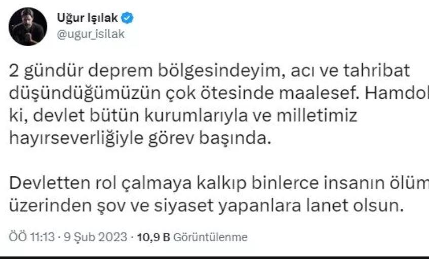 Bu süreçte destek veren isimlerden biri de ünlü ses sanatçısı Uğur Işılak oldu. Işılak sosyal medya hesabından yaptığı paylaşımla deprem bölgesinden son durum hakkında bilgilendirmede bulundu.
