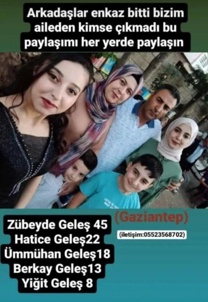 Gaziantep'te enkazda kaldığı belirtilen Geleş ailesine ulaşılamadığı bildirildi.
