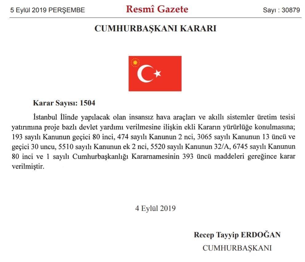 İstanbul’da yapılacak İHA ve akıllı sistemler üretim tesisiyle ilgili 5 Eylül 2019’da Resmi Gazete’de yayımlanan 30879 sayılı Cumhurbaşkanlığı kararına dayandırılan belgelerde; BAYKAR’a hiçbir maddi destek sağlanmadığı, 600 milyon TL’nin BAYKAR’ın gerçekleştireceği yatırım bedeli olduğu görüldü.