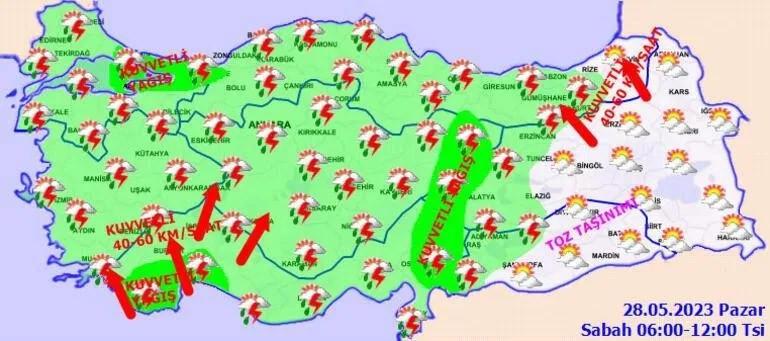 Meteoroloji Genel Müdürlüğü tarafından yapılan son değerlendirmelere göre: Ülkemiz genelinin parçalı ve çok bulutlu, Marmara, Ege, Akdeniz, İç Anadolu, Karadeniz, Doğu Anadolu (Şırnak ve Hakkari hariç), Güneydoğu Anadolu’nun kuzeyi, Gaziantep ve Kilis çevreleri ile Van’ın batı kesimlerinin sağanak ve gök gürültülü sağanak yağışlı geçeceği tahmin ediliyor. Yağışların: Marmara’nın doğusu, İç Ege, İç Anadolu’nun kuzeybatısı, Batı Karadeniz’in iç kesimleri ile Burdur, Antalya, Osmaniye, Kahramanmaraş, Sivas, Tokat, Ordu ve Malatya çevrelerinde yerel olmak üzere kuvvetli olması bekleniyor. Güneydoğu Anadolu'da toz taşınımı görüleceği tahmin ediliyor.