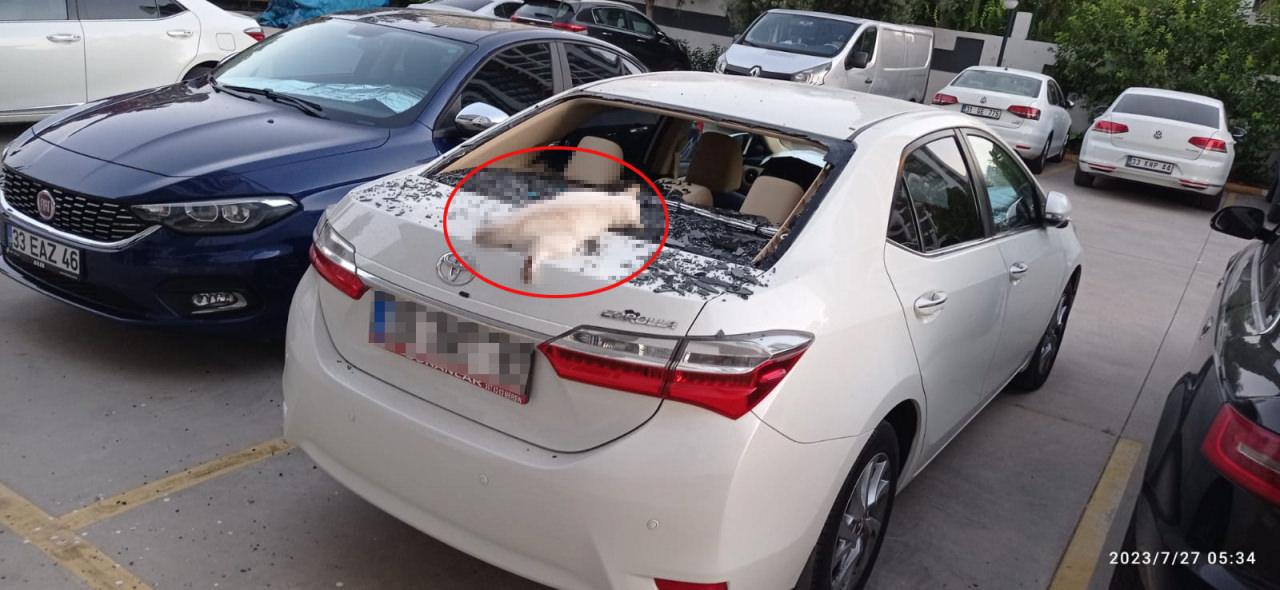 Site içindeki park halinde bulunan bir aracın arka kısmına düşen kedi, düştüğü noktada can verirken aracın arka camı ve kaportasına ağır zarar verdi.
