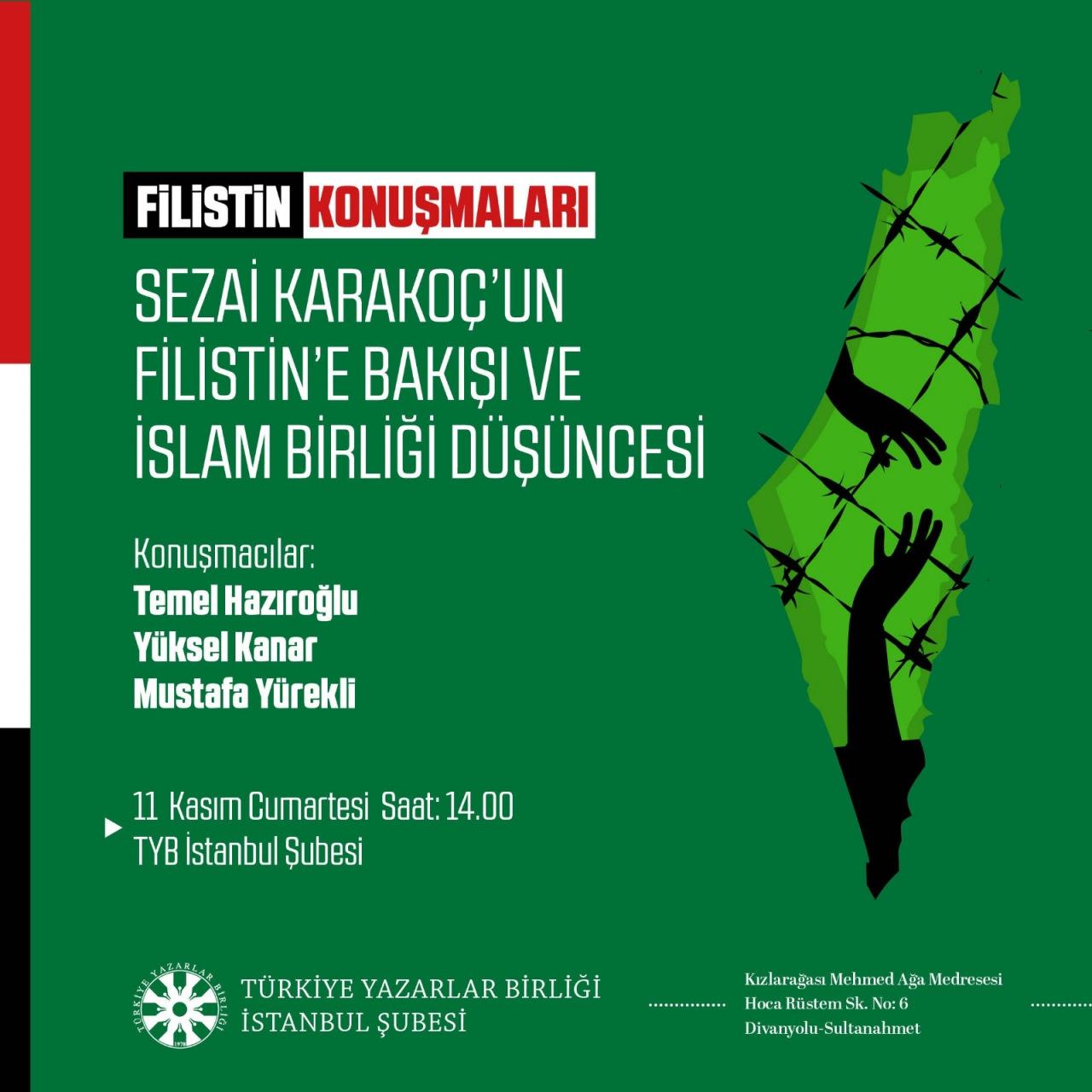 Türkiye Yazarlar Birliği İstanbul Şubesi tarafından, 'Sezai Karakoç'un Filistin'e bakışı ve İslam birliği düşüncesi' adlı program düzenlenecek.
