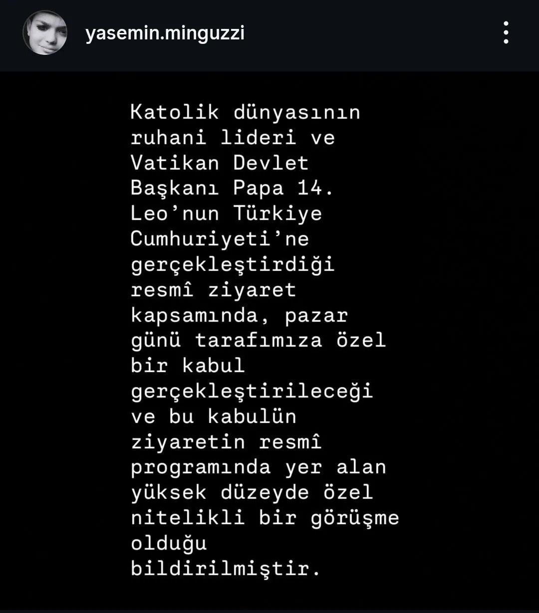 Minguzzi şunları yazdı: “Vatikan Devlet Başkanı Papa 14. Leo’nun Türkiye Cumhuriyeti’ne gerçekleştirdiği resmî ziyaret kapsamında, pazar günü tarafımıza özel bir kabul gerçekleştirileceği ve bu kabulün ziyaretin resmî programında yer alan yüksek düzeyde özel nitelikli bir görüşme olduğu bildirilmiştir.”