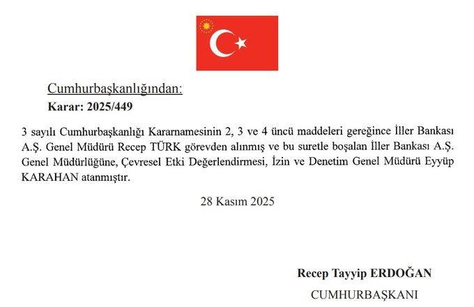 Kararlara göre, İller Bankası A.Ş. Genel Müdürü Recep Türk görevden alınırken, yerine Çevresel Etki Değerlendirmesi, İzin ve Denetim Genel Müdürü Eyyüp Karahan getirildi. Karahan'dan boşalan yere ise, aynı yer Genel Müdür Yardımcısı Fatih Ekmekçi atandı.