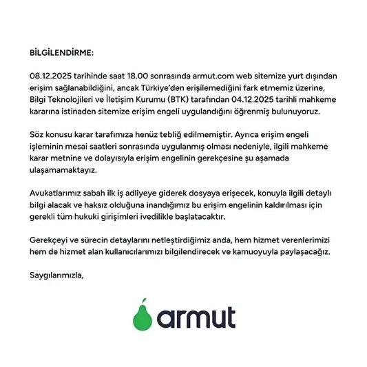 Online hizmet platformu Armut.com, mahkeme kararıyla erişime kapatıldı. Platform üzerinden temizlik, nakliye, tamirat ve tadilat gibi hizmetler için müşteriler ile hizmet verenleri buluşturan Armut.com’un web sitesi ve mobil uygulamasına erişim sağlanamıyor.