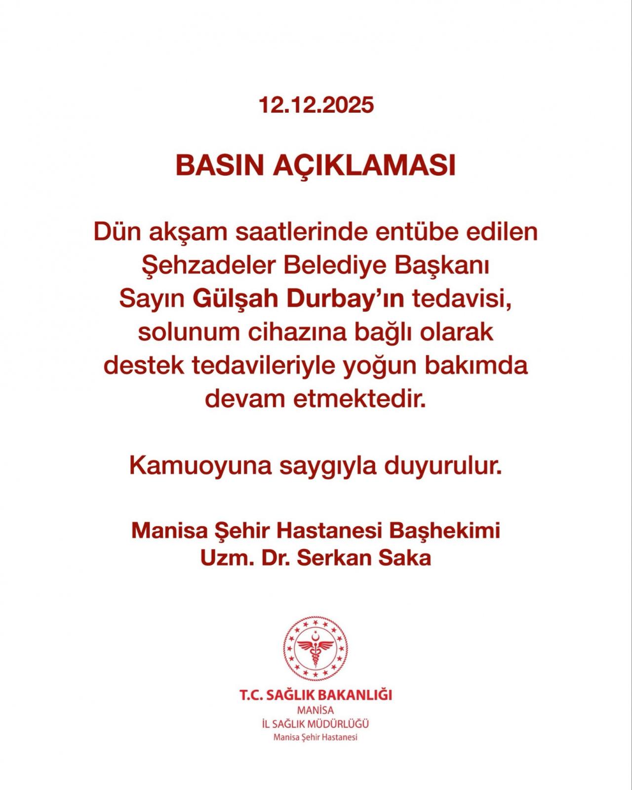 "Dün akşam saatlerinde entübe edilen Şehzadeler Belediye Başkanı Sayın Gülşah Durbay'ın tedavisi, solunum cihazına bağlı olarak destek tedavileriyle yoğun bakımda devam etmektedir. Kamuoyuna saygıyla duyurulur."