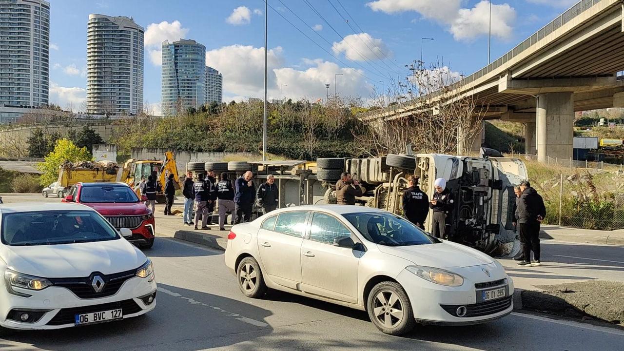 Başakşehir'de sürücüsünün direksiyon hakimiyetini kaybettiği hafriyat kamyonu, refüje çarptıktan sonra karşı şeride devrildi. Şoför yara almadan kurtulurken, kaza sebebiyle yol bir süre trafiğe kapatıldı.