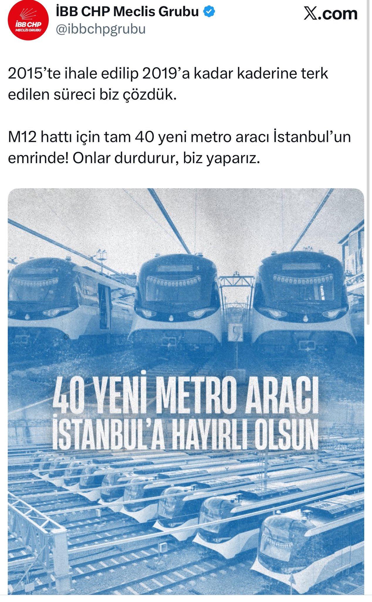 İBB CHP Meclis Grubu’nun resmi sosyal medya hesabından konuya ilişkin yapılan açıklamada, 2015 yılında ihale edilen sürecin 2019 yılına kadar kaderine terk edildiği öne sürüldü. Açıklamada, “2015’te ihale edilip 2019'a kadar kaderine terk edilen süreci biz çözdük. M12 hattı için tam 40 yeni metro aracı İstanbul’un emrinde! Onlar durdurur, biz yaparız.” denildi.