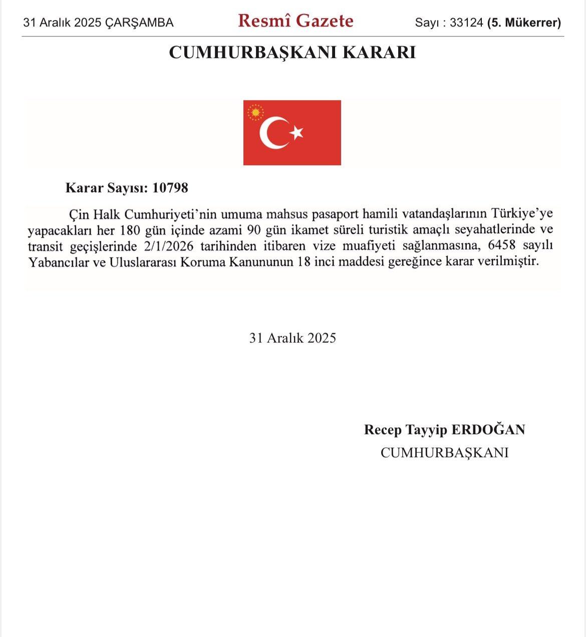 Resmi Gazete'de yayımlanan Cumhurbaşkanı Kararı ile Çin Halk Cumhuriyeti'nin umuma mahsus pasaport hamili vatandaşlarının Türkiye'ye yapacakları her 180 gün içinde azami 90 gün ikamet süreli turistik amaçlı seyahatlerinde ve transit geçişlerinde 2/1/2026 tarihinden itibaren vize muafiyeti sağlanmasına karar verildi.