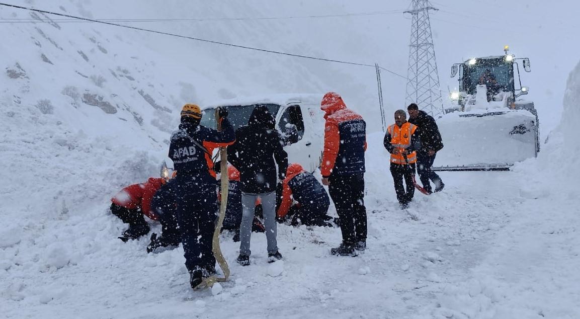Yoldaki kar yığınını temizleyen ekipler, araçta bulunan iki kişiyi çıkardı. Araç da ekiplerin desteğiyle güvenli güzergaha götürüldü.
