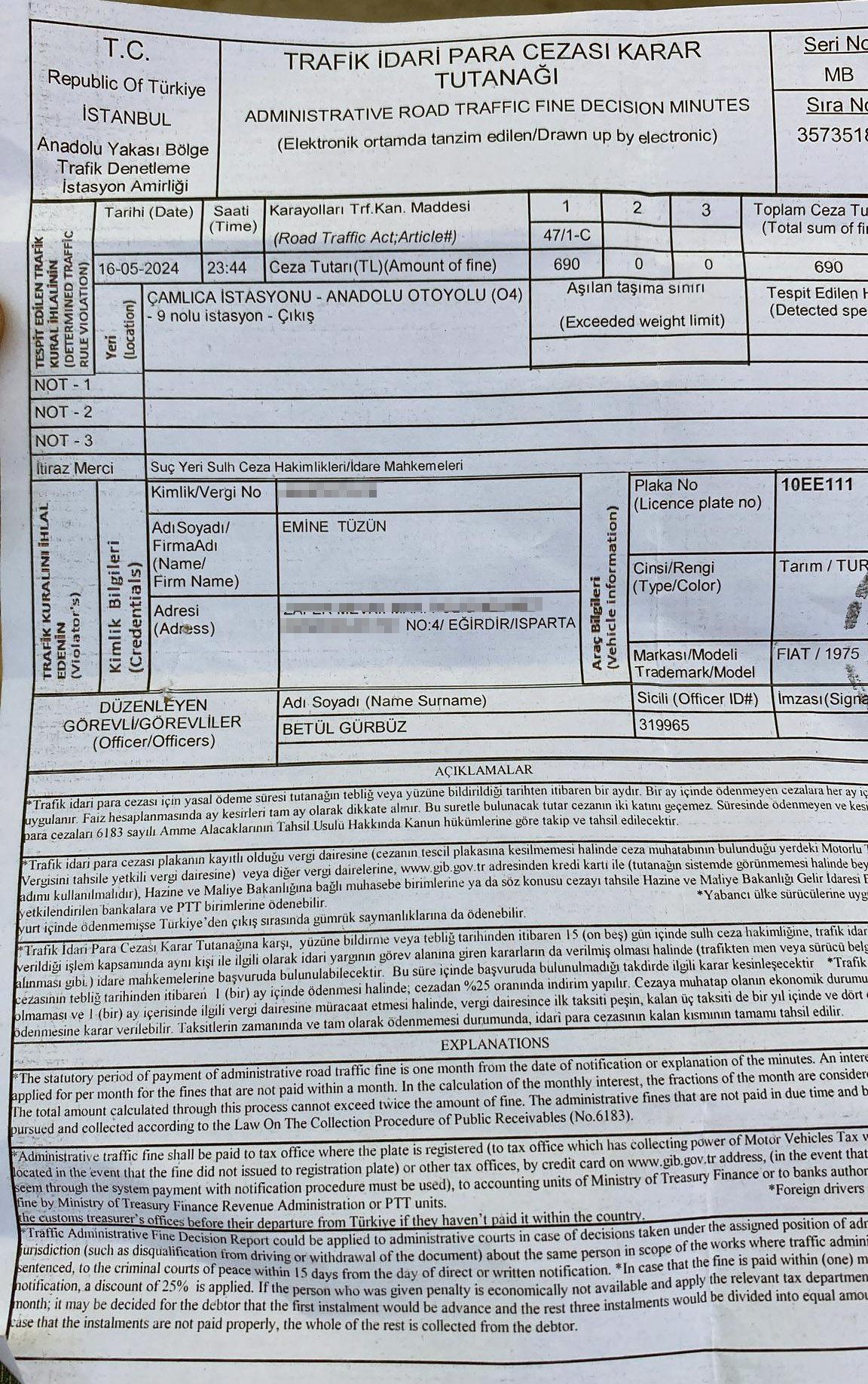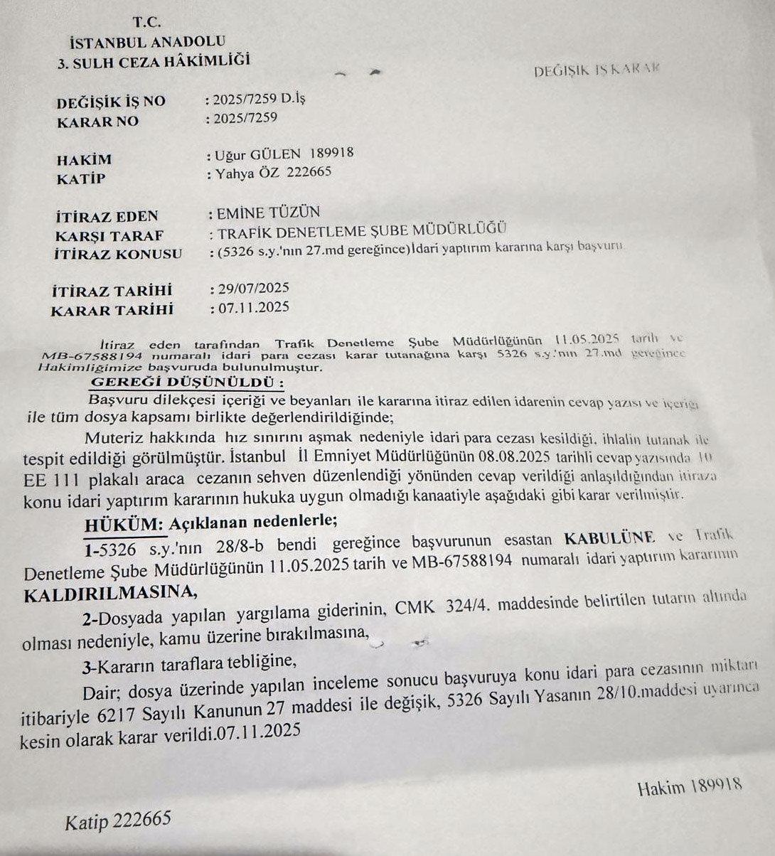 Bu cezaların tebligatı 2022 yılında yapılan Emine Tüzün, itirazları sonrası haklı bulundu ve cezalar iptal edildi. 2024 yılı Mayıs ayında İstanbul Kuzey Çevre Yolu'nda hız sınırını aştığı gerekçesiyle 690 lira ceza yazıldığına dair bir tebligat alan Emine Tüzün, buna da itiraz etti.