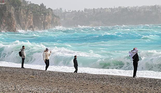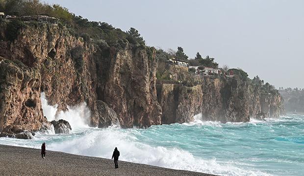 Antalya'da sabah saatlerinden itibaren kuvvetli rüzgar ve fırtına etkili oluyor. Kuvvetli rüzgar nedeniyle Konyaaltı Sahili'nde dalgaların boyu 1,5 metreyi buldu.