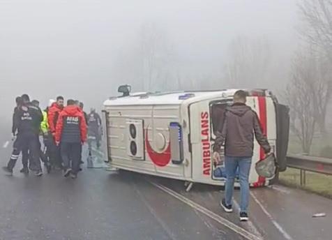 Düzce'de özel bir hastaneye ait ambulansın bariyerlere çarparak devrildiği kazada 2 kişi yaralandı.