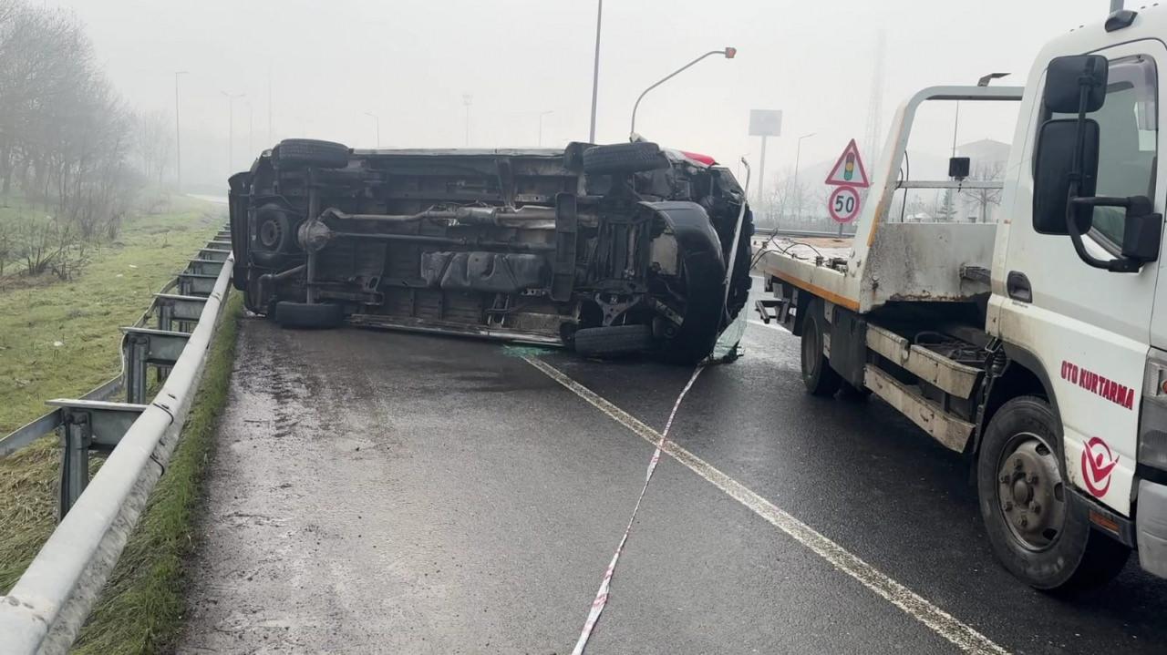 Düzce'de sabah saatlerinde kuzey çevre yolunda kaza meydana geldi. C.T. idaresindeki özel bir hastaneye ait ambulans yoğun sis nedeniyle sürücüsünün direksiyon kontrolünü kaybetmesi sonucu bariyerlere çarparak devrildi.
