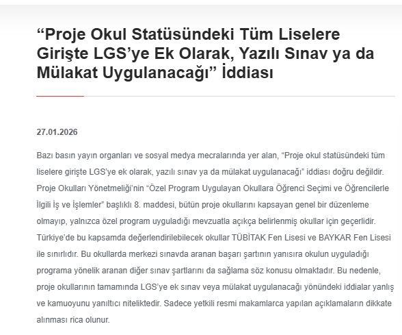 Dezenformasyonla Mücadele Merkezi (DMM) açıklama yaparak, “Proje okul statüsündeki tüm liselere girişte LGS’ye ek olarak, yazılı sınav ya da mülakat uygulanacağı” iddiası doğru değildir." ifadelerini kullandı.