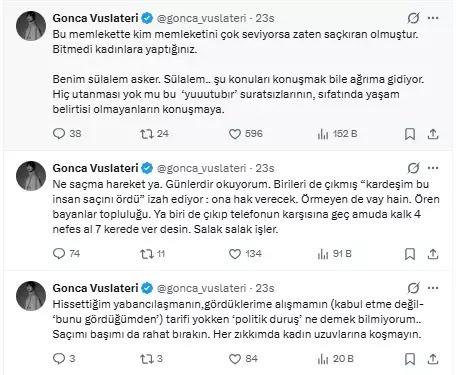 Kadınlar üzerinden yürütülen kampanyalara karşı olduğunu vurgulayan Vuslateri, "Bu memlekette kim memleketini çok seviyorsa zaten saçkıran olmuştur. Bitmedi kadınlara yaptığınız." ifadelerini kullandı.