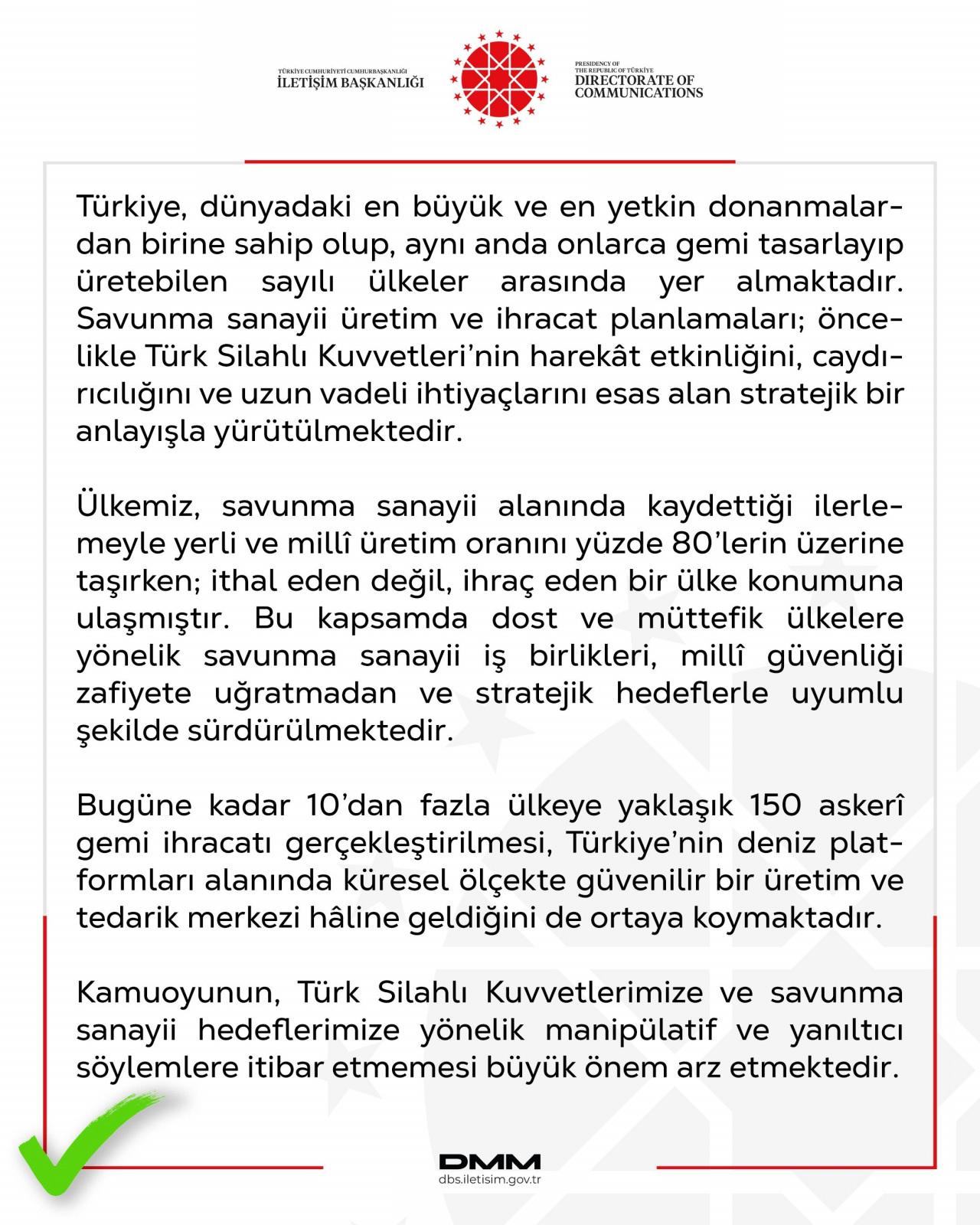"Bazı basın yayın organları ve sosyal medya mecralarında yer alan; Türk Deniz Kuvvetleri için planlanan gemilerin ticari kaygılarla elden çıkarıldığı yönündeki iddialar dezenformasyon içermektedir. Türkiye, dünyadaki en büyük ve en yetkin donanmalardan birine sahip olup, aynı anda onlarca gemi tasarlayıp üretebilen sayılı ülkeler arasında yer almaktadır.