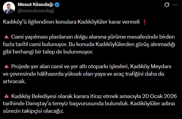 Kararın ardından Kadıköy Belediye Başkanı Mesut Kösedağı'ndan dikkat çeken bir açıklama geldi. Kösedağı, Kadıköy'ü ilgilendiren konularda Kadıköylülerin söz sahibi olması gerektiğini vurgulayarak, cami yapılması planlanan dolgu alanına yürüme mesafesinde birden fazla tarihî caminin bulunduğunu hatırlattı.