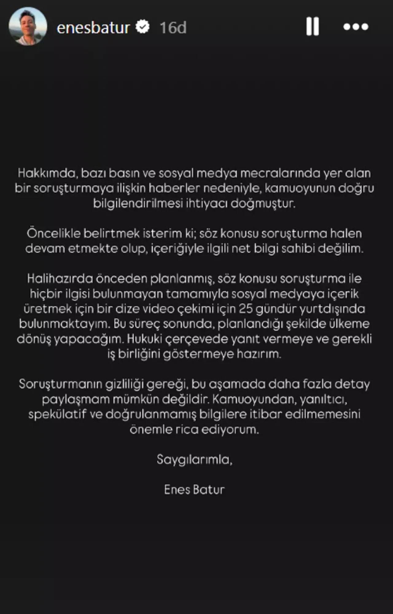 'Öncelikle belirtmek isterim ki; söz konusu soruşturma halen devam etmekte olup, içeriğiyle ilgili net bilgi sahibi değilim. Halihazırda önceden planlanmış, söz konusu soruşturma ile hiçbir ilgisi bulunmayan, tamamıyla sosyal medyaya içerik üretmek için bir dizi video çekimi için 25 gündür yurt dışında bulunmaktayım. Bu süreç sonunda, planlandığı şekilde ülkeme dönüş yapacağım. Hukuki çerçevede yanıt vermeye ve gerekli işbirliğini göstermeye hazırım. Soruşturmanın gizliliği gereği, bu aşamada daha fazla detay paylaşmam mümkün değildir. Kamuoyundan, yanıltıcı, spekülatif ve doğrulanmamış bilgilere itibar edilmemesini önemle rica ediyorum.'