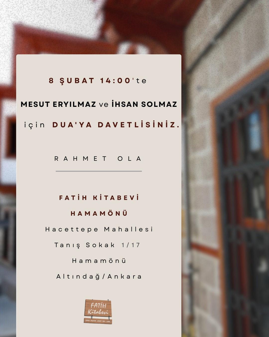 Ankara Hamamönü'nde bulunan Fatih Kitabevi, 8 Şubat'ta Mesut Eryılmaz ve İhsan Solmaz adına düzenlenecek dua programına ev sahipliği yapacak.