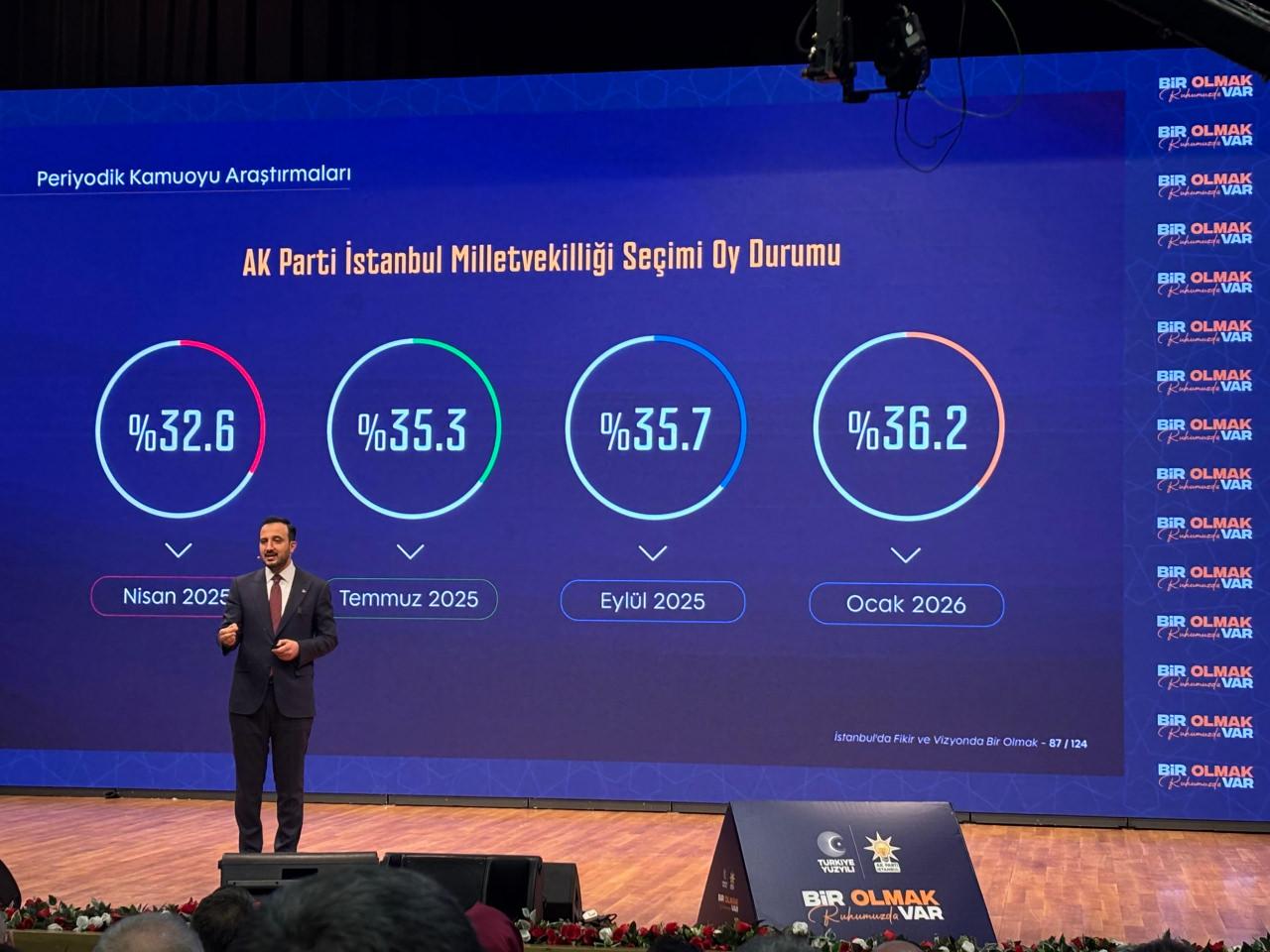 İstanbul milletvekilliği seçimi için paylaşılan periyodik araştırmalarda da artış dikkat çekti. Nisan 2025’te yüzde 32,6 olarak ölçülen oy oranı, Temmuz 2025’te yüzde 35,3’e, Eylül 2025’te yüzde 35,7’ye ve Ocak 2026’da yüzde 36,2’ye yükseldi.