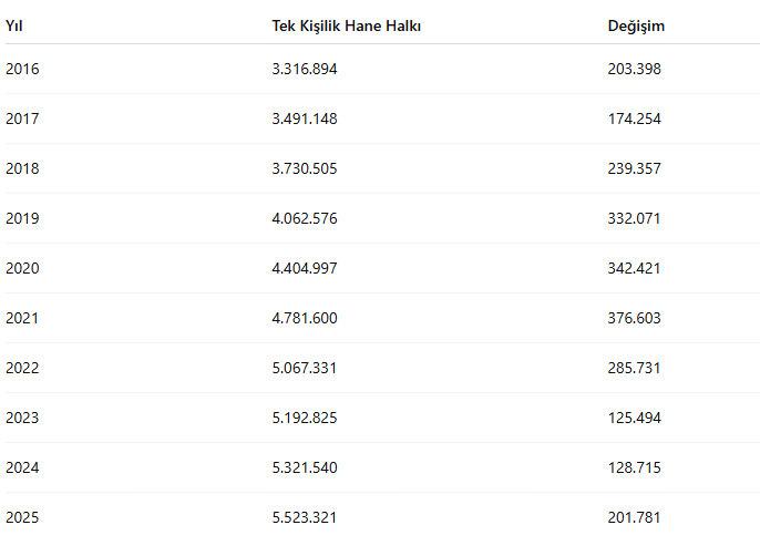 TÜİK verilerine göre, tek kişilik hane halkı sayısı ve değişimi (2016-2025) şöyle: