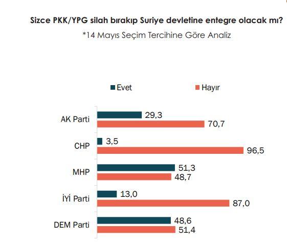 Ana muhalefet partisi CHP seçmeninin dahi yüzde 50,7’si bu konuda olumsuz görüş bildirirken, Suriye’de merkezi hükümet ile SDG/PYD arasındaki çatışma sürecinde halkı Nusaybin’de sokağa çağıran DEM Parti seçmeninin yüzde 81,4’ü de muhalefetin Suriye politikasını başarısız olarak değerlendirdi.