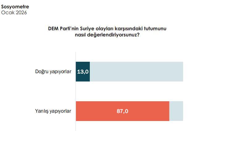 Araştırma bulgularına göre; Toplumun yüzde 13’ü DEM Parti’nin bu süreçte doğru bir tutum sergilediğini düşünürken, yüzde 87’si partinin yanlış bir tutum içinde olduğu görüşünü paylaştı.