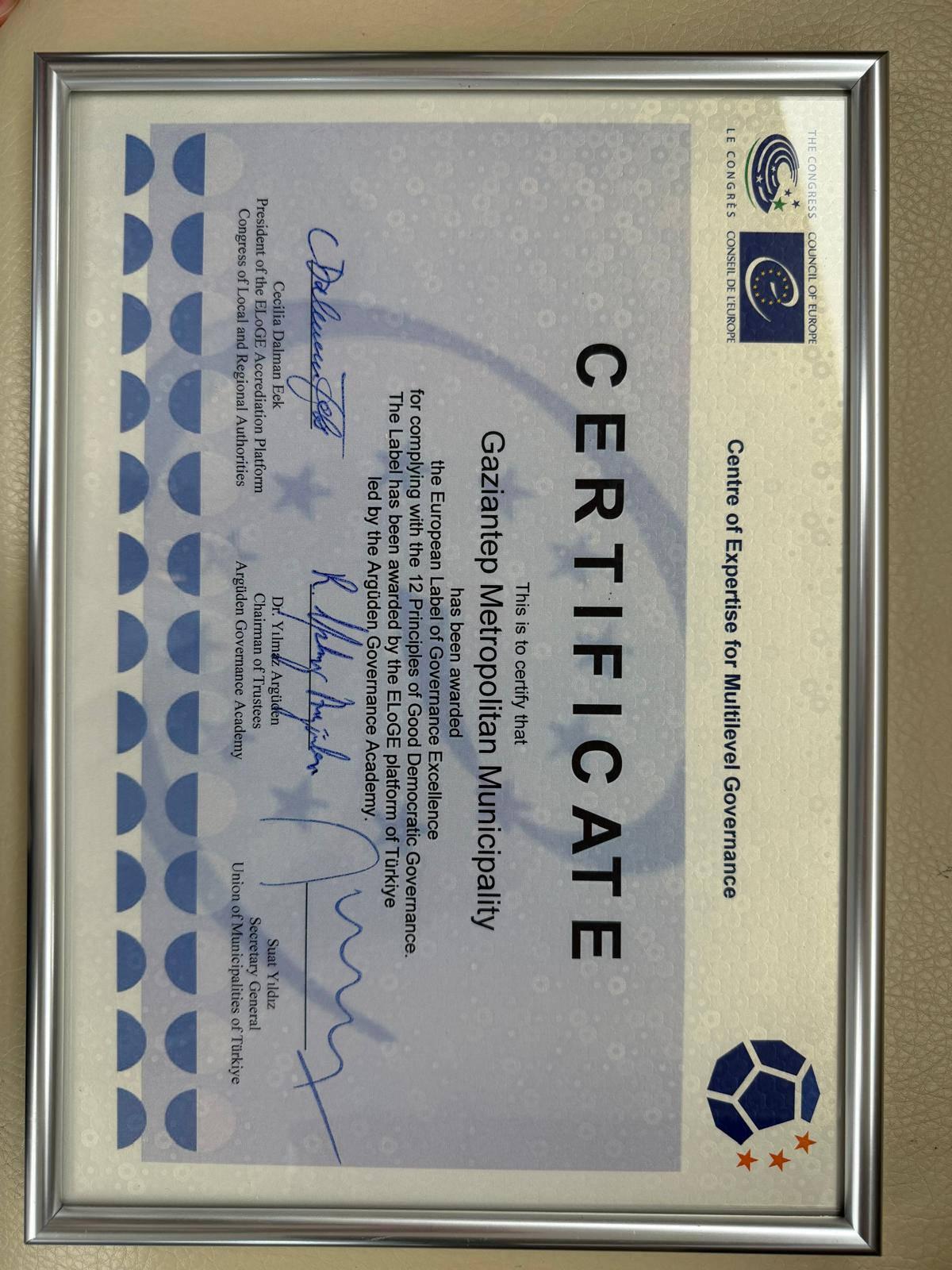 Büyükşehir Belediyesi, 12 ilke ve 97 kriter çerçevesinde gerçekleştirilen kapsamlı değerlendirme sonucunda Avrupa Konseyi tarafından verilen Avrupa Yönetişim Mükemmelliği Markası (ELoGE) ödülüne layık görüldü. Ödül, Gaziantep Büyükşehir Belediyesi Başkan Vekili Abdulkadir Sökücü tarafından teslim alındı.