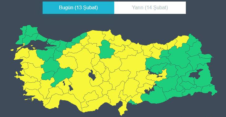 Meteoroloji Adana, Adıyaman, Amasya, Ankara, Antalya, Artvin, Aydın, Balıkesir, Bolu, Burdur, Çanakkale, Çankırı, Denizli, Elazığ, Eskişehir, Gaziantep, Giresun, Gümüşhane, Hatay, Isparta, Mersin, İzmir, Kastamonu, Kayseri, Kırşehir, Konya, Malatya, Manisa, Kahramanmaraş, Muğla, Nevşehir, Niğde, Ordu, Rize, Samsun, Sinop, Sivas, Tokat, Trabzon, Yozgat, Aksaray, Karaman, Kırıkkale, Karabük ve Osmaniye için sarı kodlu uyarı verildi.