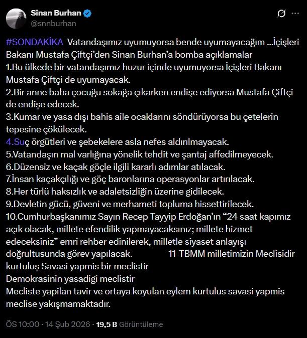 Gazeteci Sinan Burhan'a açıklamalarda bulunan Bakan Çiftçi, suçla mücadeleden düzensiz göçe, toplumsal huzurdan devlet-millet ilişkisine kadar kritik konularda önemli mesajlar verdi.